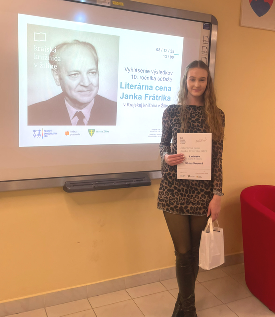 A práve na 3. priečke v kategórii stredných škôl sa umiestnila Klára Kozová, ktorá si ocenenie prevzala 8. decembra 2025 v Krajskej knižnici v Žiline. Víťazke srdečne blahoželáme, želáme veľa ďalších tvorivých počinov a ďakujeme za krásnu reprezentáciu našej školy.
