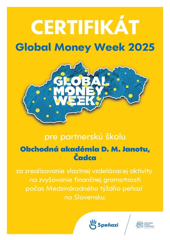 Preveruj si „dobré“ rady, nech neskočíš na návnady („Think before you follow, wise money tomorrow“) – téma kampane GMW 2025 – naša obchodná akadémia jednou z partnerských stredných škôl. V týždni od 17. do 23. marca 2025 sme v rámci medzinárodnej kampane zrealizovali rôzne aktivity v oblasti finančného vzdelávania pre žiakov oboch študijných odborov (obchodná akadémia – bilingválne štúdium a obchodná akadémia), ako napríklad prednášku spojenú s besedou Druhý a tretí dôchodkový pilier pre žiakov IV. B, IV. C a V. A triedy a workshop Finančná gramotnosť – Finančná sloboda pre žiakov III. B, III. C a IV. A triedy. Zapojili sme sa aj do súťaže „Global Money Week SR 2025“, ktorú usporiadala Národná banka Slovenska. Žiaci vytvorili a zaslali videá zachytávajúce ich v pozícii „finfluencerov“ nabádajúcich k opatrnosti a k potrebe vyhodnocovať informácie a overovať rôzne zdroje informácií – stali sme sa jednou so šestnástich vyžrebovaných výherných škôl.