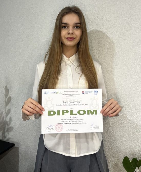 Vynikajúce umiestnenie dosiahla Ivana Časnochová, ktorá zvíťazila v odbore 17 - Pedagogika, sociológia, psychológia a postupuje do celoslovenského finále. Jej práca má názov Mládež a EÚ: Príležitosti, ktoré otvárajú dvere do sveta. Konzultantkou práce bola PhDr. Škrobánková.