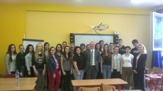 Predstavil pani riaditeľke, vyučujúcim nemeckého jazyka a následne aj študentom bilingválneho štúdia v nemeckom jazyku z 1.B2 a 2.B2 budúcu partnerskú spoluprácu v oblasti študentskej zahraničnej praxe v Rakúsku.